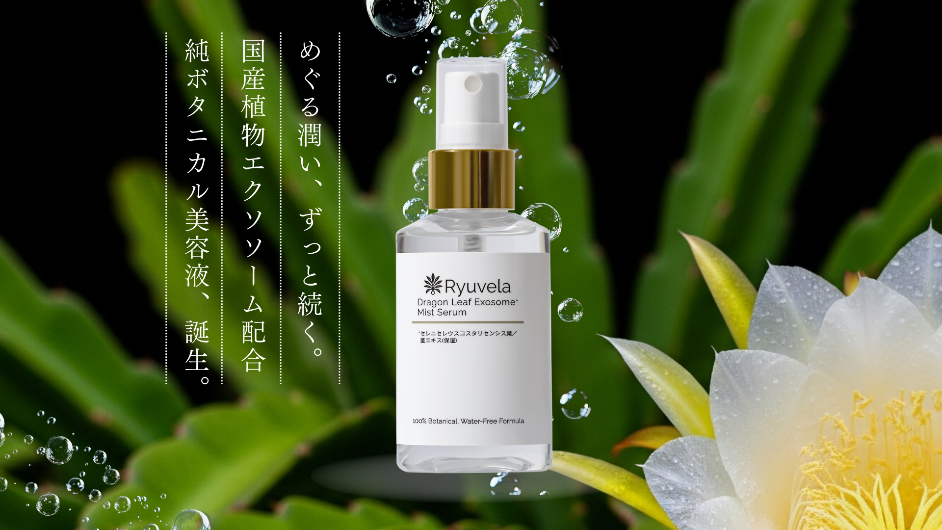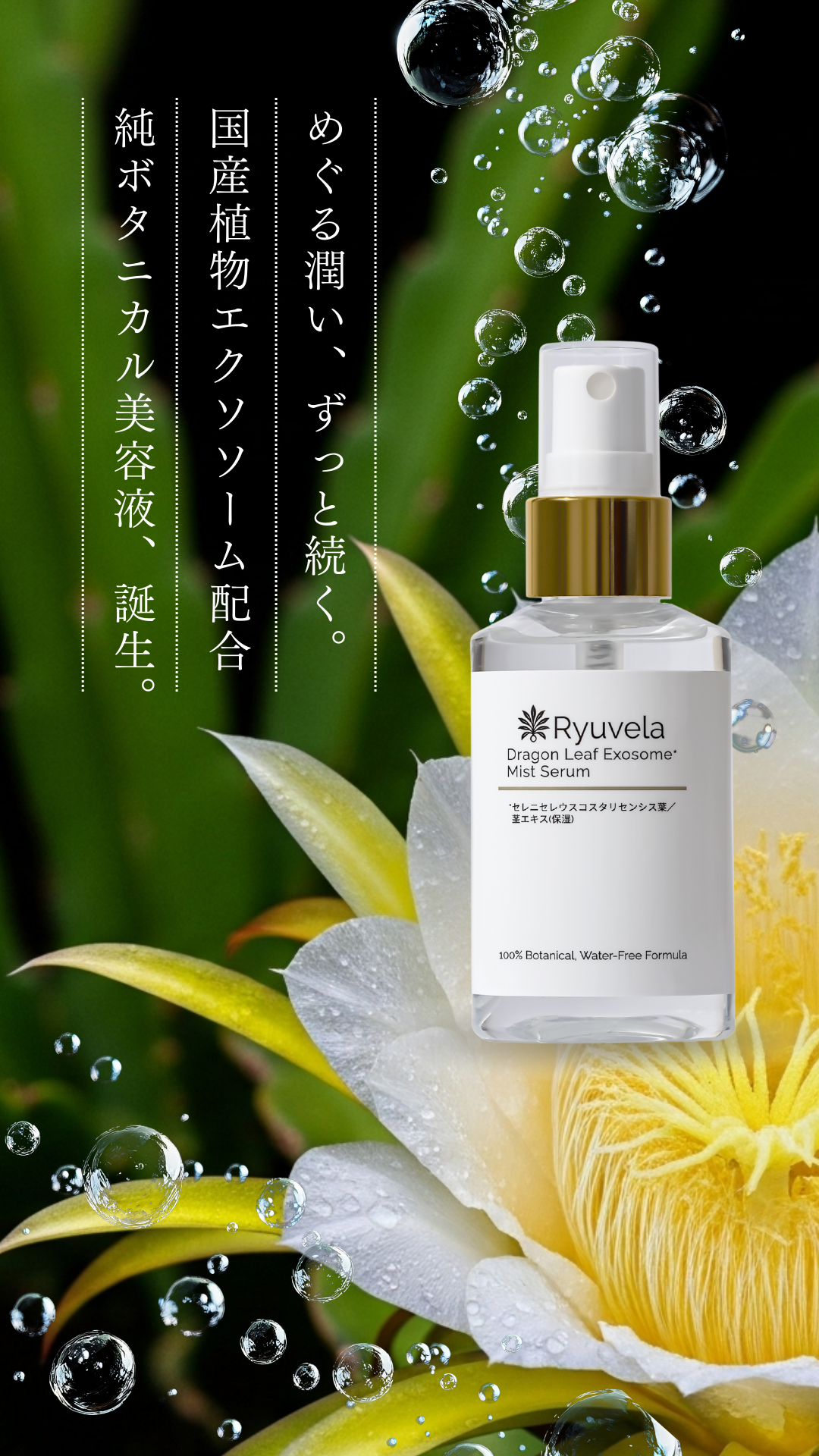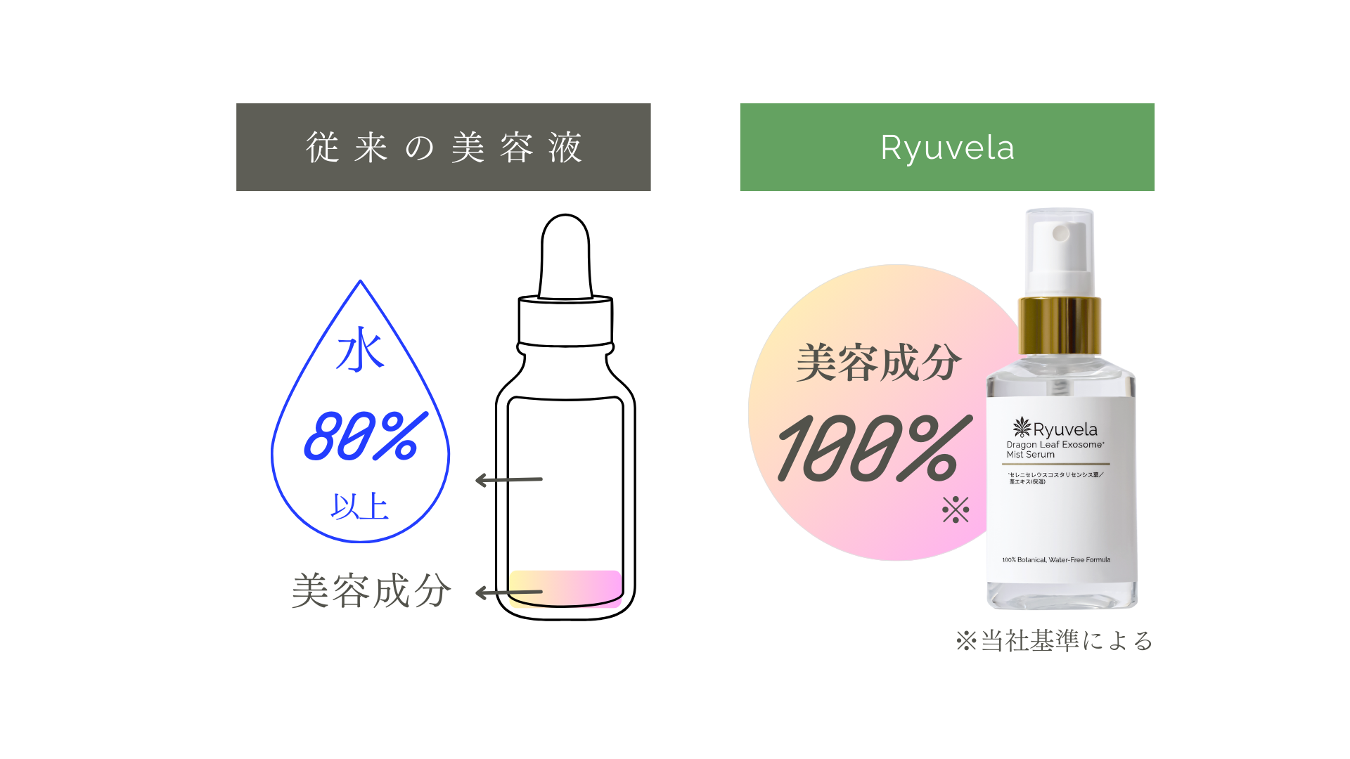 通常の化粧品では、水が80%以上、美容成分わわずか数パーセント程度ということもありますが、Ryuvelaは100%植物由来の美容成分のみのシンプル処方を実現しています。